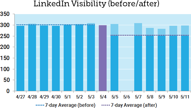 How does this 7-day before/after comparison work with the LinkedIn incident? Here’s a graph of the before/after with dotted lines added for the two means: