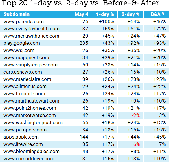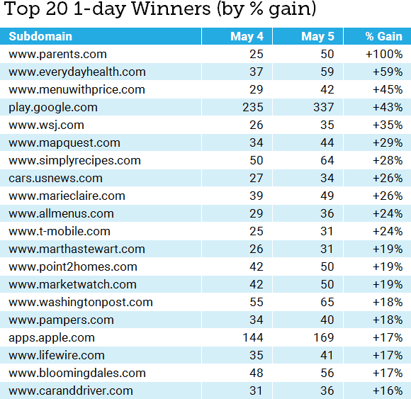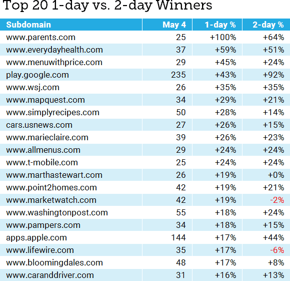 Some of the big players are the same, but we’ve also got some newcomers — including sites that looked like they lost visibility on day one, but have stacked up 2-day and 7-day gains.