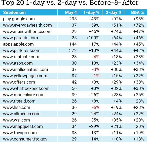 Obviously, this is a lot to digest in one table, but we can start to see where the before-and-after metric (the relative difference between 7-day means) shows a different picture, in some cases, than either the 1-day or 2-day view. Let’s go ahead and re-build the top 20 based on the before-and-after percentage change: