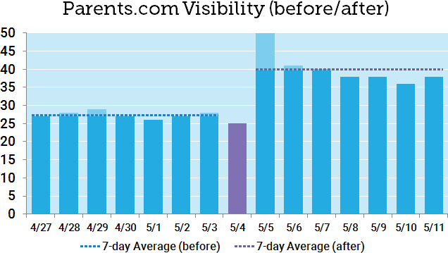 Let’s take a quick look at Parents.com, our original big winner (winnerer? winnerest?). Day one showed a massive +100% gain (doubling visibility), but day-two numbers were more modest, and before-and-after gains came in at just under half the day-one gain. Here are the seven days before and after: