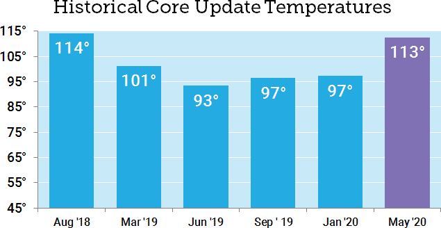 How does this compare to previous Core Updates? With the caveat that recent temperatures have been well above historical averages, the May 2020 Core Update was our second-hottest Core Update so far, coming in just below the August 2018 “Medic” update.