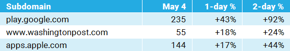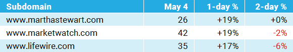 The table below adds in the 2-day relative percentage gained. I’ve kept the same 25 subdomains and will continue to sort them by the 1-day percentage gained, for consistency: