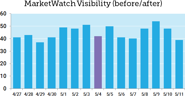 Looking at even a small bit of historical data, we can see that MarketWatch, like most news sites, experiences significant volatility. The “gains” on May 5 are only because of losses on May 4. It turns out that the 7-day mean after May 4 (45.7) is only a slight increase over the 7-day mean before May 4 (44.3), with MarketWatch measuring a modest relative gain of +3.2%.