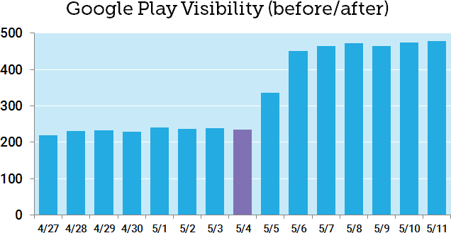 You don’t even need to do the math to spot the difference here. Comparing the 7-day mean before May 4 (232.9) to the 7-day mean after (448.7), Google Play experienced a dramatic +93% relative change after the May Core Update.