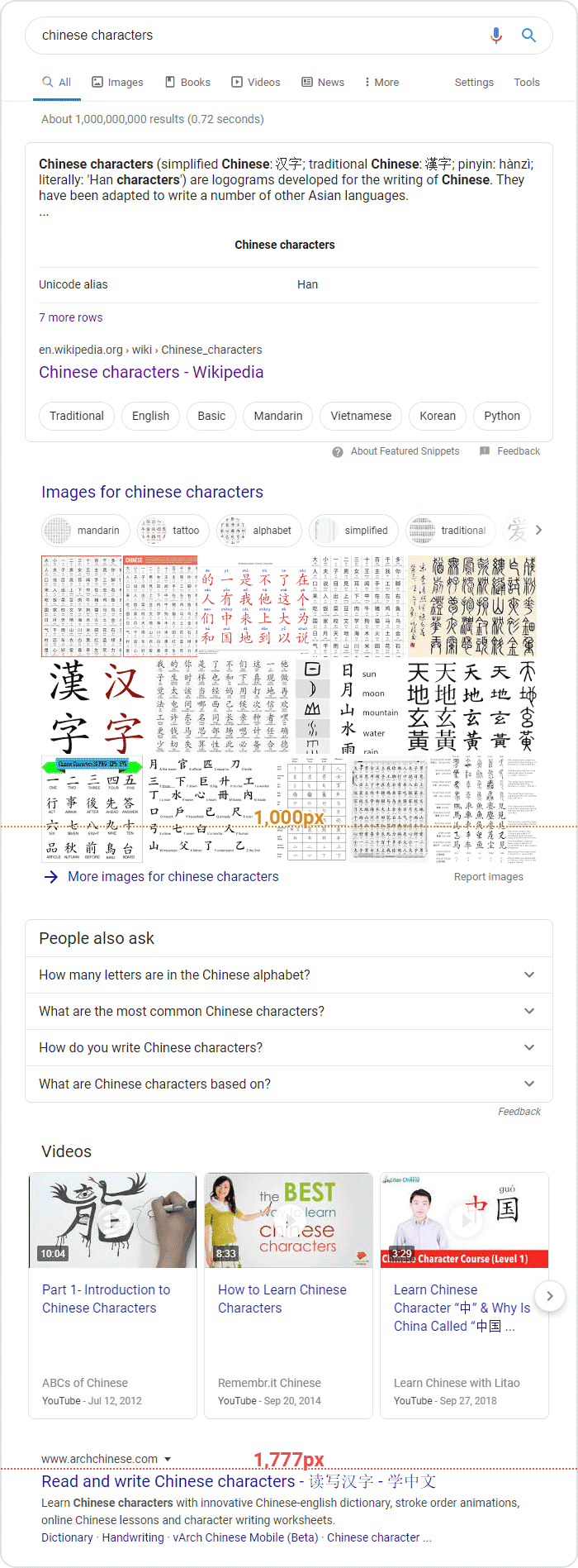 Overall in our study, the average Y-position of #1 results with featured snippets was 99px lower/worse (704px) than traditional #1 results (605px), suggesting a net disadvantage in most cases. In some cases, multiple SERP features can appear between the featured snippet and the #2 organic result. Here’s an example where the #1 and #2 result are 1,342px apart …