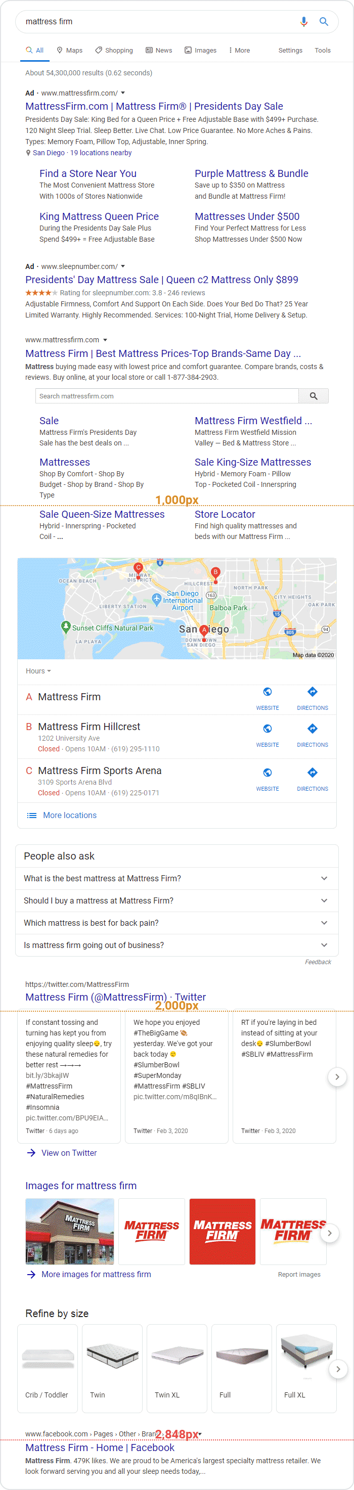This isn’t just about vertical position — unless you’re Mattress Firm, trying to compete on this search really doesn’t make much sense. They essentially own page one, and this is a situation we’re seeing more and more frequently for searches with clear dominant intent (i.e. most searchers are looking for a specific entity).