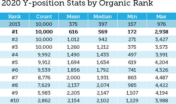 At 2,938px, the 2020 winner comes in at just over three times 2013’s worst-case scenario. You may have noticed that the line is slightly above the organic link. For the sake of consistency and to be able to replicate the data later, we chose to use the HTML/CSS container position. This hits about halfway between the organic link and the URL breadcrumbs (which recently moved above the link). This is a slightly more conservative measure than our 2013 study.