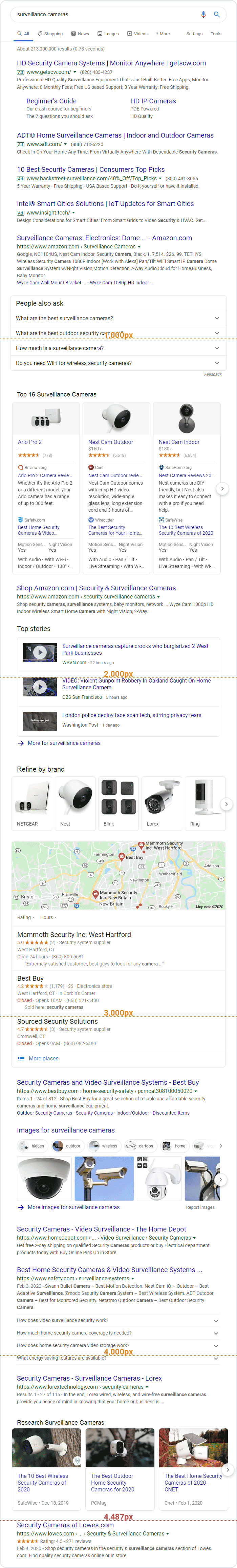 Congratulations, you’re finally done scrolling. This SERP has seven traditional organic positions (including one with FAQ links), plus an incredible seven rich features and a full seven ads (three are below the final result). Note that this page shows the older ad and organic design, which Google is still testing, so the position is measured as just above the link.