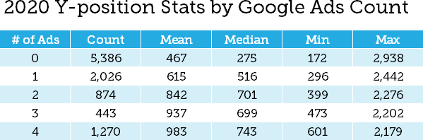 Since our 2013 study (in early 2016), Google removed right-hand column ads on desktop and increased the maximum number of top-left ads from three to four. One notable point about ads is that they have prime placement over both organic results and SERP features. So, how does this impact organic Y-positions? Here’s a breakdown …