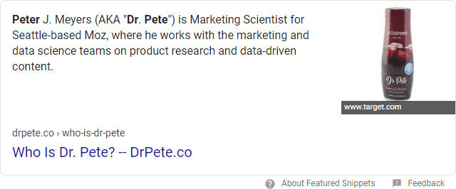 In early 2014, a year after our original study, Google launched featured snippets, promoted results that combine organic links with answers extracted from featured pages. For example, Google can tell you that I am both a human who works for Moz and a Dr. Pepper knock-off available at Target …