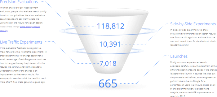 Note that Google uses “launches” and “improvements” somewhat interchangeably. This diagram provided a fascinating peek into Google’s process, and also revealed a startling jump from 13,311 precisions evaluations (changes that were shown to human evaluators) to 118,812 in just two years.