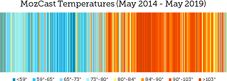 Since MozCast has kept the same keyword set since almost the beginning of data collection, we’re able to make some long-term comparisons. The graph below represents five years of temperatures. Note that the system was originally tuned (in early 2012) to an average temperature of 70°F. The redder the bar, the hotter the temperature …