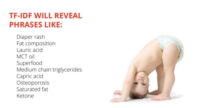 Don’t be surprised if what it surfaces is a bit of a head-scratcher. Remember: TF-IDF won’t reveal words like your keyword. It’s going to reveal words associated with your keyword. For instance, my keyword, “coconut oil,” surfaced “diaper rash.” Who’da thunk?