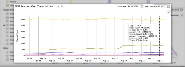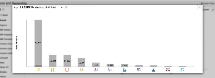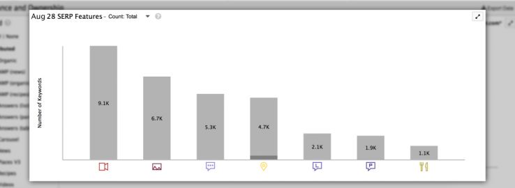 Our [Current Day] SERP Features chart now shows how our chosen features stack up against each other in terms of share of voice. Apparently, videos have such a small impact that they don’t even warrant a bar on the chart.