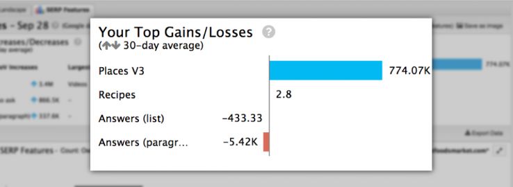 The Your Top Gains/Losses module tells us that our hard work is paying off for places packs. Not only has this result type grown in influence on the SERPs in general, but we’ve managed to increase our share. Woo!