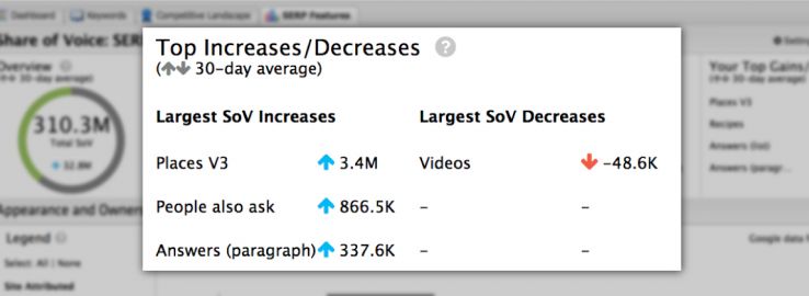 The Top Increases/Decreases module shows us that places, PAAs, and paragraph snippets have gained the most share of voice on our SERPs. The metric for each feature tells us exactly how much movement has been made between the current day and the segment’s 30-day average.