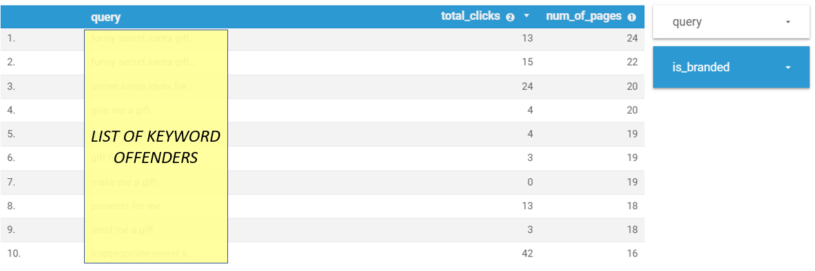 The table above captures the full list of keyword offenders for the period of time selected. For instance, keyword ‘X’ at the top of the table has generated 13 organic clicks (total_clicks) from GSC over the period considered and changed ranking URL approximately 24 times (num_of_pages).