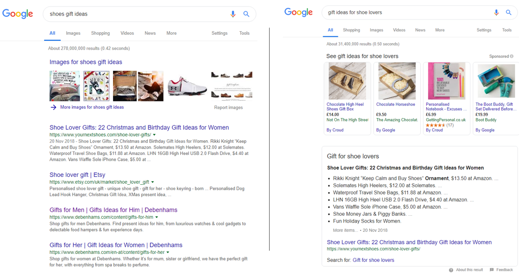 For instance, when searching for ‘shoes gift ideas’ and ‘gift ideas for shoe lovers’ I get two very different SERPs despite the fact that my intent is kind of the same: I am looking for ideas for a gift which involves shoes.