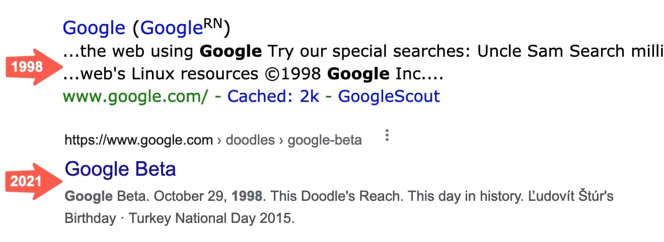 The standard Google search snippet has changed over the years, but in essence all the key elements are still there: