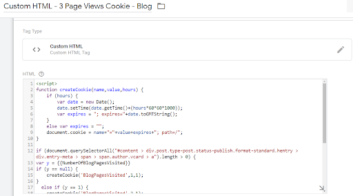 Following Google’s example, I’ve called my tag Custom HTML – 3 Page Views Cookie – Blog.