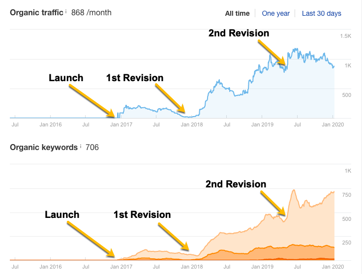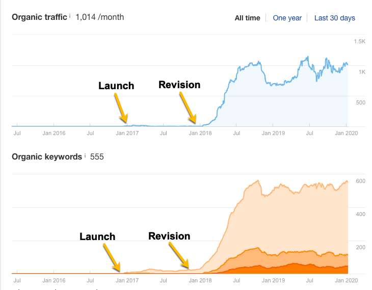 - Variant keywords on the URL. There is a good chance, through adding depth to your content, that you will rank for more variant keywords, which will drive more traffic. Plug your URL into your tool of choice and track the number of ranking keywords.