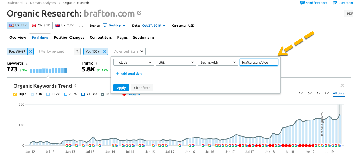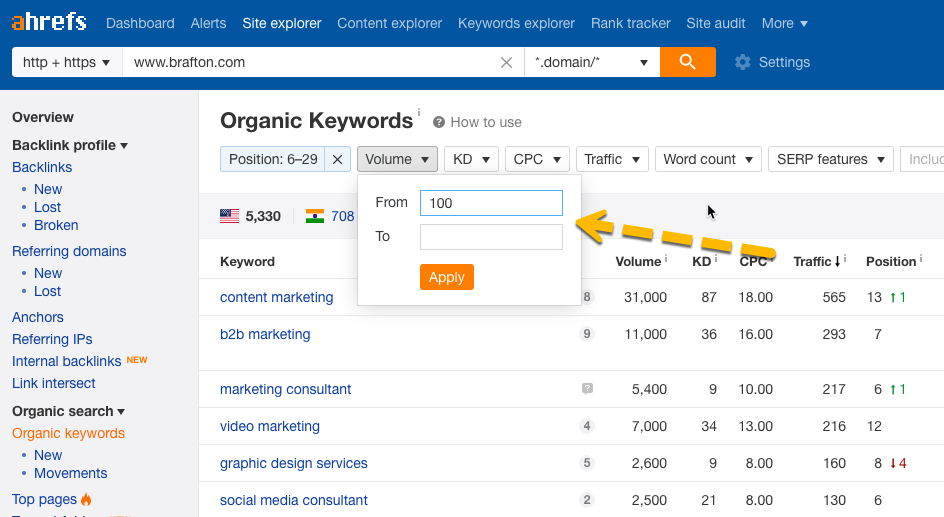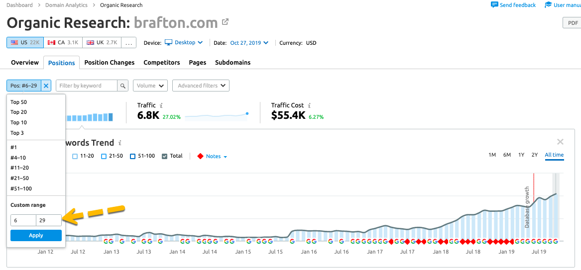 Note: you can do this in any major SEO tool. Simply find the list of all keywords you rank for, and filter it to include only positions 6-29. I will jump around a few tools to show you what it looks like in each.