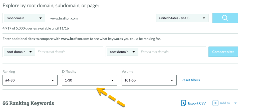 Here’s how it will look in Moz. Note: Moz has predefined ranges, so we won’t be able to hit the exact thresholds outlined, but we will be close enough.