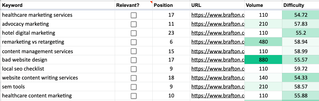 Now that you have a list of only relevant keywords, you now know the following: Each threshold keyword has significant search volume, reasonable keyword difficulty, corresponds to a blog (optional), and is commercially relevant.