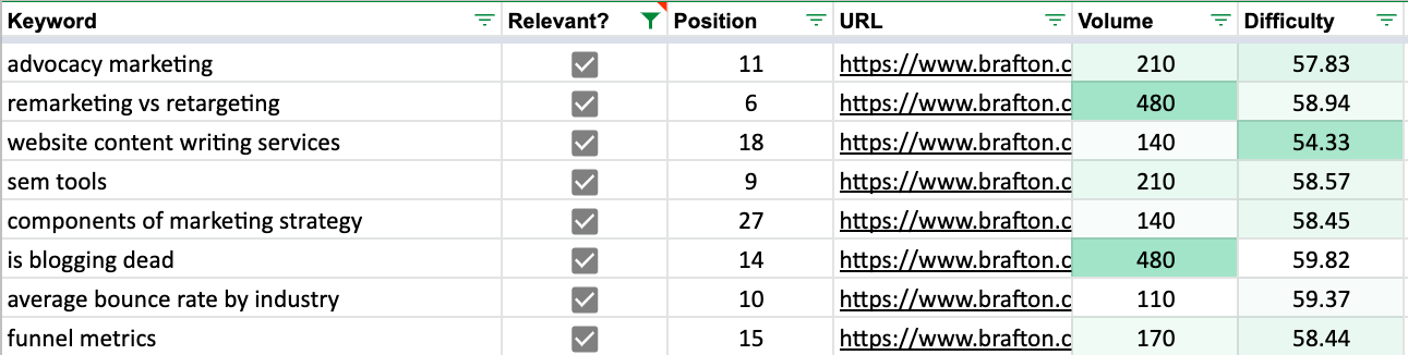 The resulting list will leave you with threshold keywords with significant search volume and reasonable difficulty scores, from blog content only.