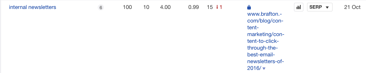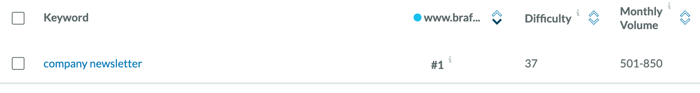 Sure enough, we rank in position 1 for the keyword “company newsletter,” which has a search volume of 501-850 per month. I’m not messing with this page at all.
