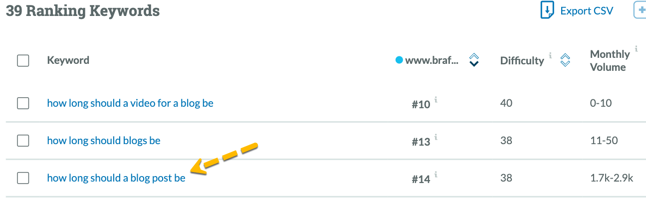 On the flipside, this list recommended that I re-optimize for “How long should a blog post be.” Plugging the URL into Moz shows me that this is indeed a great keyword to reoptimize the content for.