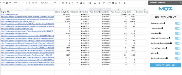 Once you have the add-on installed, you’ll need to enter your Mozscape API credentials to activate the tool. From there, simply select your metrics and add in your URLs to get the report working.