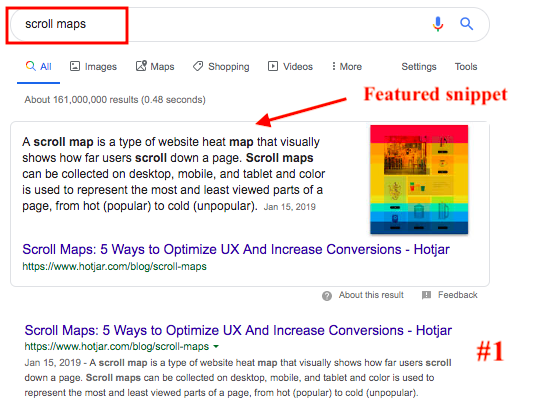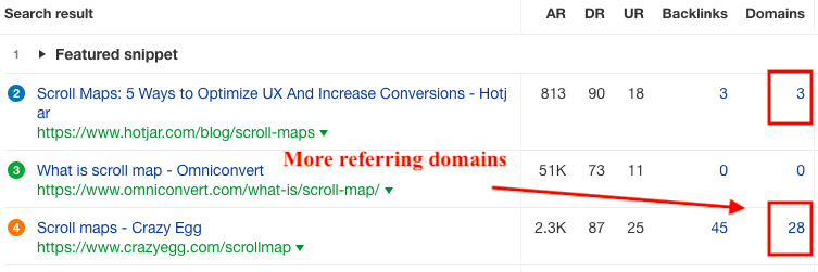 For example, Hotjar recently published an article on 5 ways to use scroll maps. Looking at the backlink profile for the top three results for “scroll map,” CrazyEgg has more referring domains than Hotjar, but is currently in position three. Omniconvert has zero backlinks and still ranks above CrazyEgg in position three. With only three referring domains, Hotjar has earned the 1st position and a coveted featured snippet.