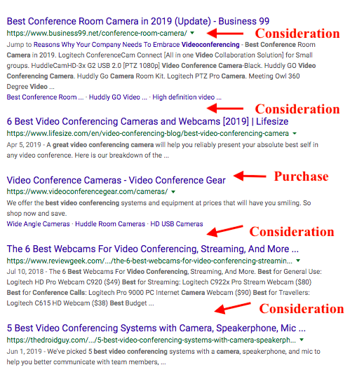 For example, the keyword “best video conferencing camera” has consideration-based intent. We can determine this by looking at the SERPs. In the screenshot below, you can see Google understands users are trying to compare different types of cameras.