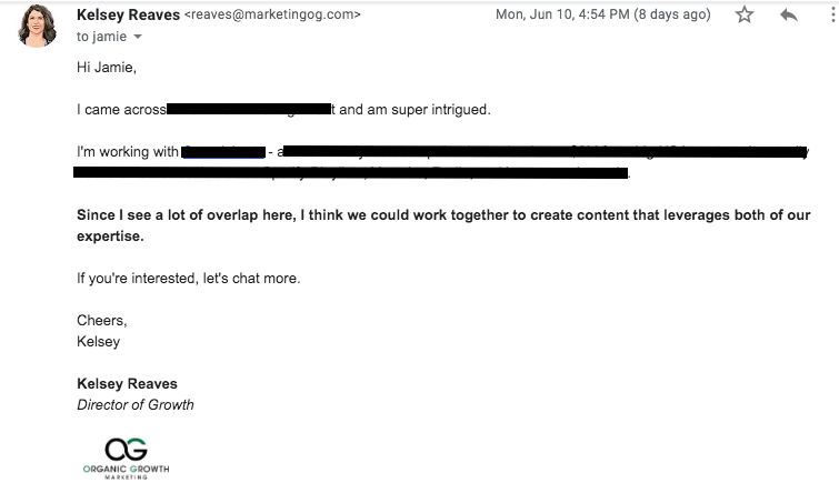 In our outreach message, we cut to the chase. If you’ve identified the right person in the previous step, then they should know exactly what you’re trying to do and why it’s important. If the person you outreached to doesn’t get the big picture and you have to explain yourself, then you’re talking to the wrong person. Plain and simple.