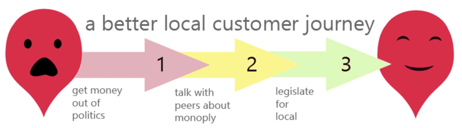 The next time you’re asked how to build out the stages of your customer’s journey, consider asking your team and bosses to begin by donning the shoes of a local business owner. They’re the people in your community who are living in real fear of being put out of business by national, state, and local policy, and of being made invisible by powerful platforms in daring to speak out. Empathy for this plight could be the start of the most genuine relationships your company has ever developed. It could even be the basis of a coalition of industry agencies and SaaS groups bringing their own, collective pressure to bear on public servants, to insist that we finally do get money out of politics and re-balance our economics to prioritize societal well-being.