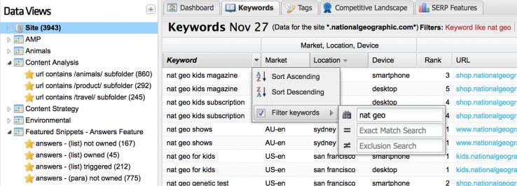 We’ve shown you some really high-level segments, but you can actually filter down your keywords even further. In other words, you can get extra fancy and add multiple filters to a single tag. Go as far as high search volume, branded keywords triggering paragraph featured snippets that you own for smartphone searchers in the downtown core. Phew!