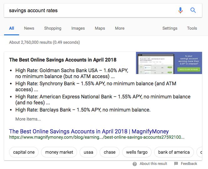 Take the above snippet for example. The query [savings account rates] produces a SERP with organic results and other features that provide general info on the subject of savings accounts. The bubbles, however, name different banks that have savings accounts, making them highly distinct keyword suggestions.