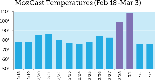 Late last week (Feb 28 – Mar 1), we saw a sizable two-day spike in Google rankings flux, as measured by MozCast. Temperatures on Friday reached 108°F. The original temperature on Thursday was 105°F, but that was corrected down to 99°F (more on that later).
