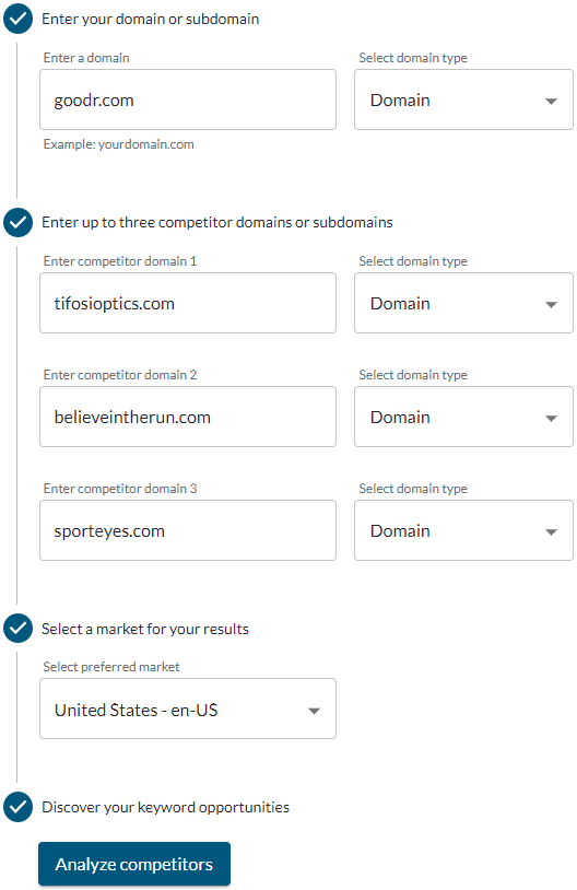 I recently bought some sunglasses from Goodr. Let’s pretend I’m analyzing their competitive SEO landscape, and I’ve picked three targeted competitors in the online sunglasses market that specialize in active customers and sports sunglasses. I’d first enter the sites in the mini-wizard: