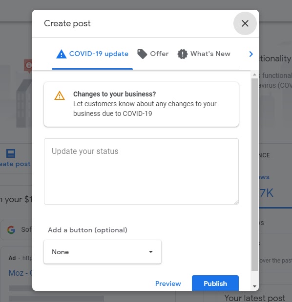 Google has newly created a Google posts type that you’ll see as an option in your GMB dashboard. While other post types have been published sporadically, I am seeing examples of the COVID-19 Update posts going live. Try to fit as much information as you can about the changed status of your business into one of these posts.