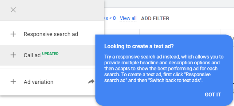The change in default ad type from Expanded Text Ads (ETAs) to Responsive Search Ads (RSAs) means that when you click to make a new ad, there are now only two options: Responsive Search Ads or Call Ads.