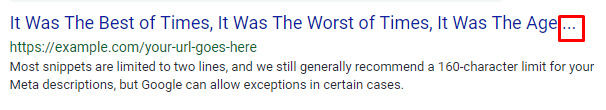 • Length: On average, search engines display the first 50–60 characters (~512 pixels) of a title tag in search results. If your title tag exceeds the characters allowed on that SERP, an ellipsis “…” will appear where the title was cut off. While sticking to 50–60 characters is safe, never sacrifice quality for strict character counts. If you can’t get your title tag down to 60 characters without harming its readability, go longer (within reason).
