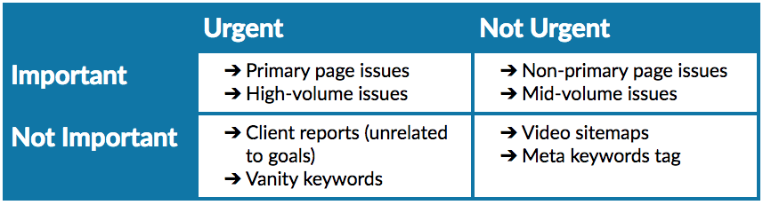 Putting out small, urgent SEO fires might feel most effective in the short term, but this often leads to neglecting non-urgent important fixes. The not urgent & important items are ultimately what often move the needle for a website’s SEO. Don’t put these off.