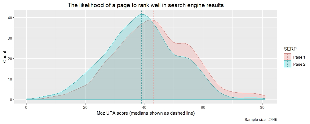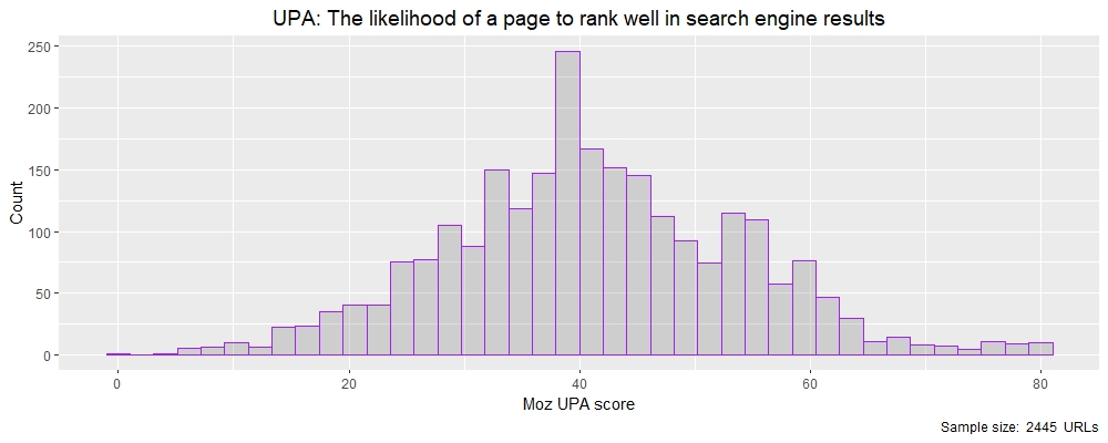 Now let’s investigate another metric that has less of a range on it than UEID and look at Moz’s UPA measure, which is the likelihood that a page will rank well in search engine results.