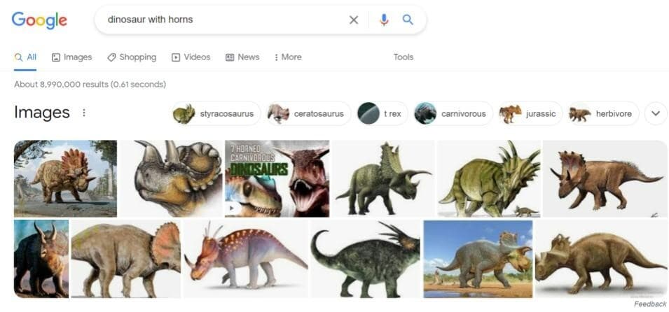 For instance, with the query dinosaur with horns, an image search will return a few different dinosaur topic filters and lots of different images. To find the best result, I would need to filter and refine the query significantly.