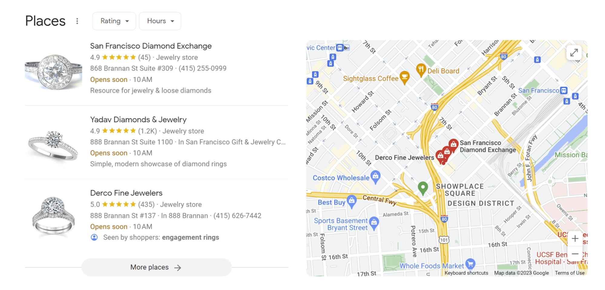 Google has gotten so good at parsing images that they are now able to match them to perceived query intent. We already know that Google differentiates between images of single products. For example, here’s a search for “engagement rings san francisco”, and do note the images in the local pack: