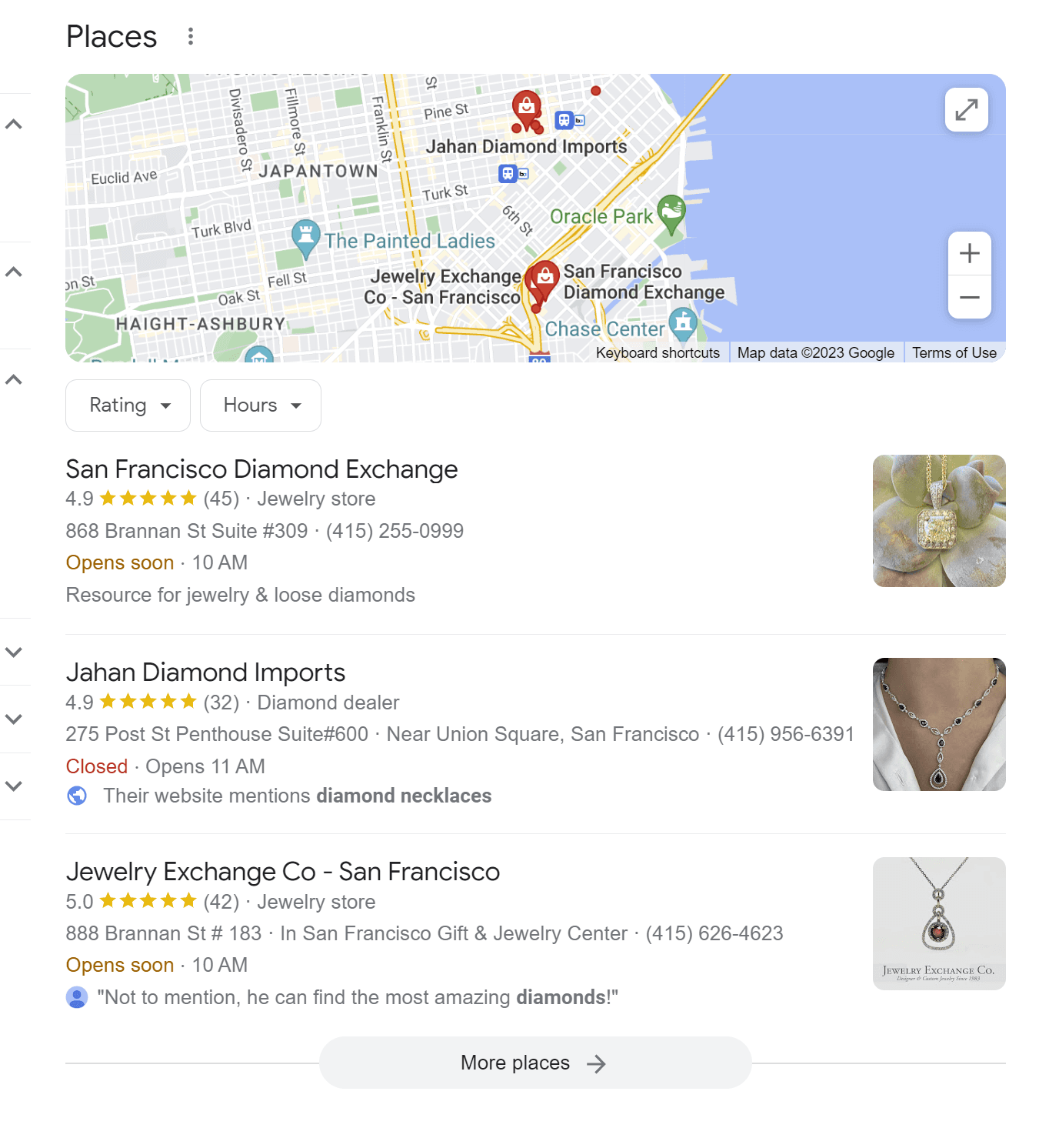 But when I change my query to “diamond necklaces san francisco”, look at how the photo for the business in the top spot changes. It’s the same company, but a totally different image chosen to match my query: