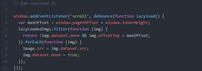 JavaScript can also affect the crawlability of images that are lazy-loaded. Here’s a basic example. This code snippet is for lazy-loading images in the DOM via JavaScript:
