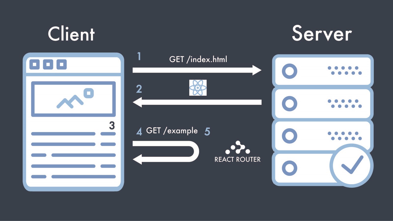 - The server then sends the index.html page to the client, containing the scripts to launch React and React Router.